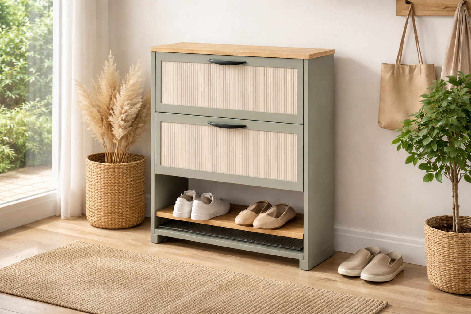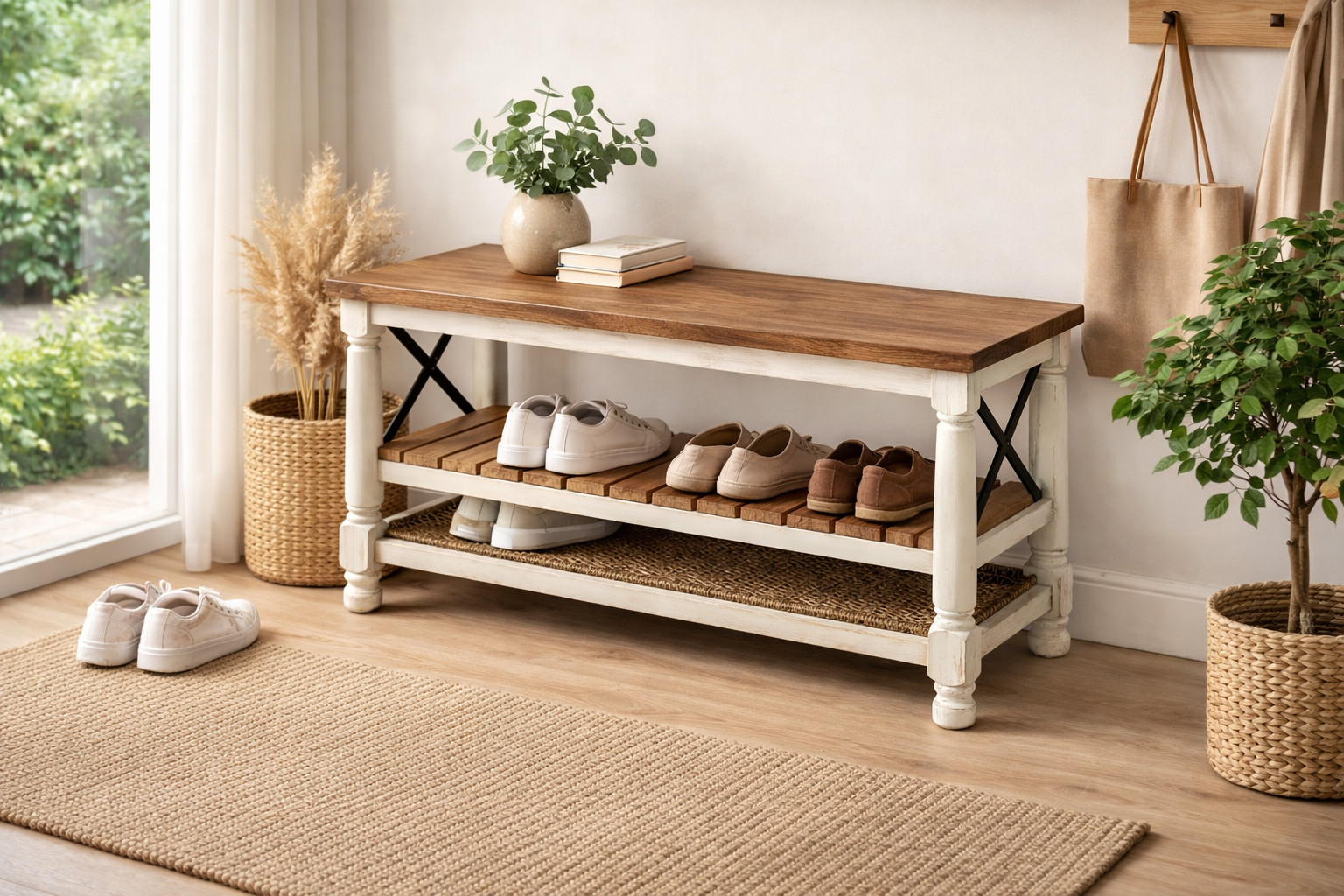 Stilvolle Schuhbank mit weißem Gestell und natürlicher Holzoberfläche. Bietet praktischen Stauraum für Schuhe und verleiht dem Eingangsbereich eine warme Atmosphäre.